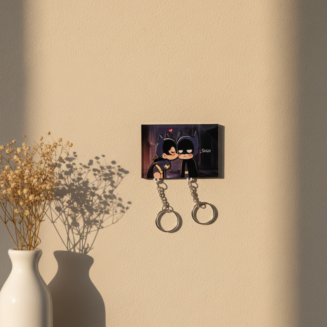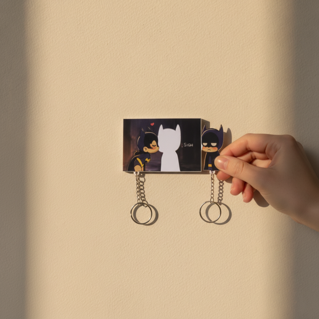 Celebrate your love—even if one of you is a little grumpy—with this unique matching couple keychain set featuring DC's dynamic duo in an irresistibly cute chibi art style. This set captures the moment Batman is receiving a kiss from his powerful partner (Batwoman/Batgirl), complete with his hilariously stoic "SIGH" of reluctant affection!